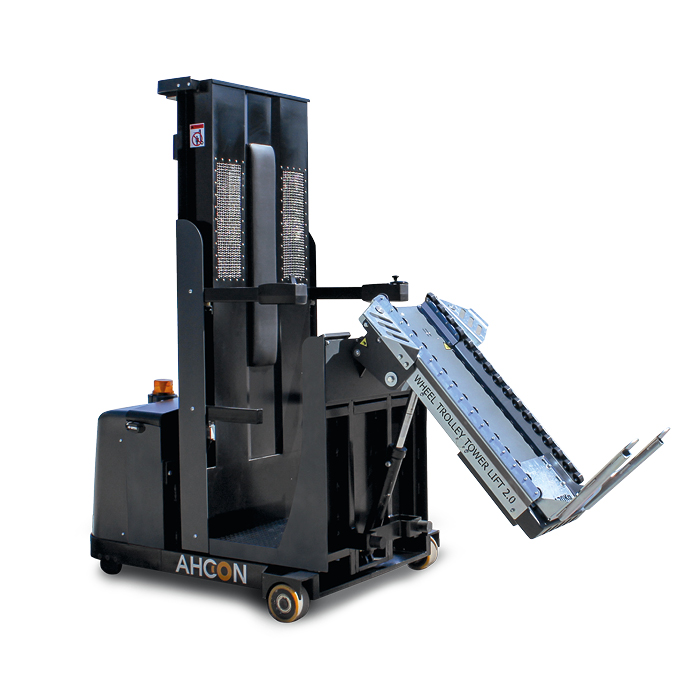 Wheel Trolley Tower Lift is a compact and space-saving truck for the ergonomically correct handling of wheels in extra-tall tyre racks – at heights of up to 6 metres.
