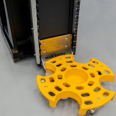Tower Lift has a customised tool at its front which is compatible with our popular Wheel Trolley. The actual handling into and out of the tyre racks is carried out by the use of Wheel Trolleys. The job of retrieving and inserting wheels from and into tyre racks can take place at an efficient pace while allowance is still made for ergonomic considerations.